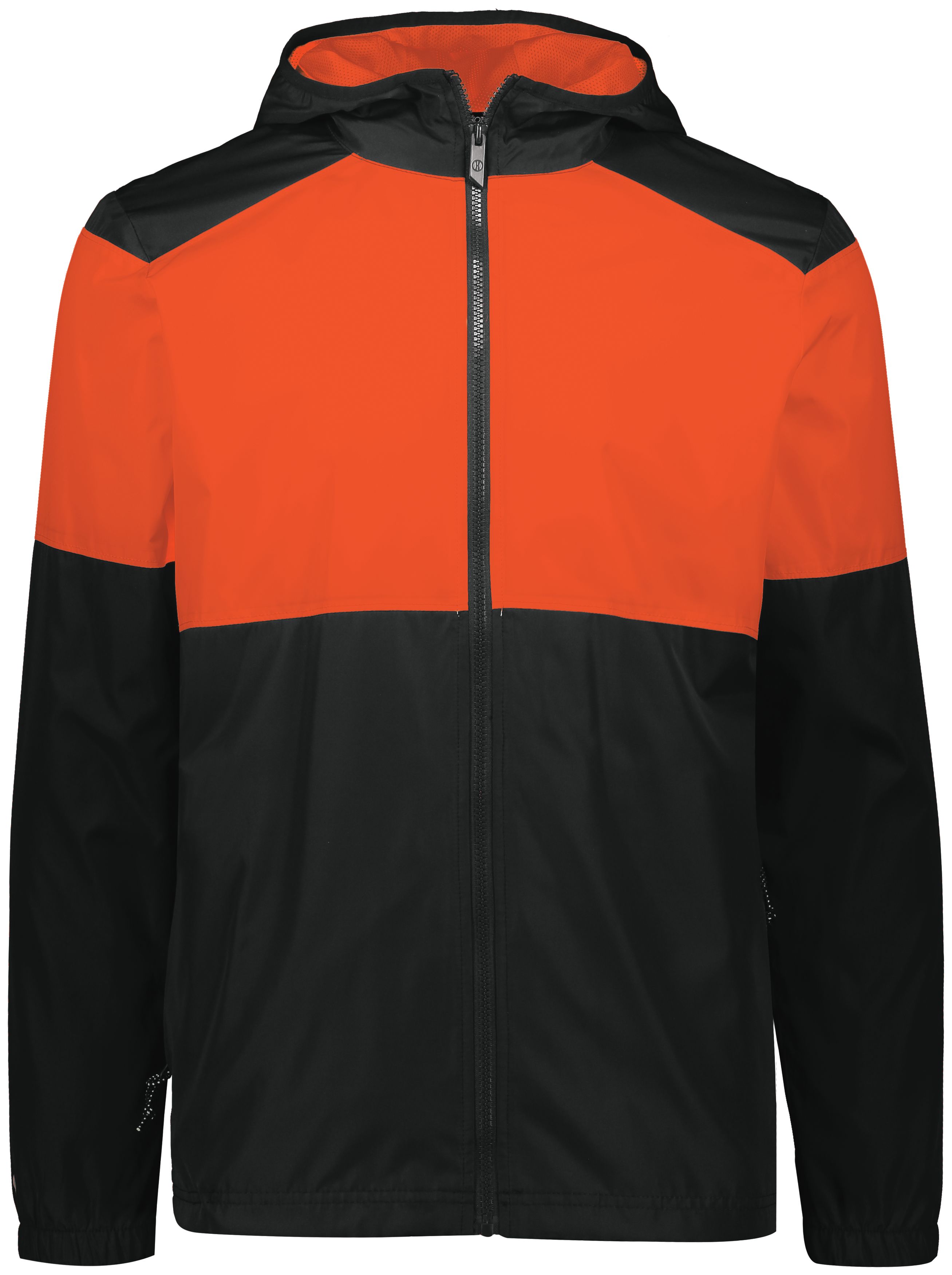 100% polyester 300-denier ripstop shell with durable water-repellent (DWR) finish 100% polyester lining Black bottom front and lower sleeves for a cleaner appearance Shell's fabric waterproof rating: 5000MM Fully seam-sealed shell Adjustable rain hood Durable, reflective 2-inch tape meets ANSI 107 requirements Full-length interior and exterior storm flaps Vented cape back Right chest pocket and retractable ID holder Two lower front pockets Center front zippered pocket to hold a tablet Gusseted cuffs Elastic hem Decoration access pocket in shell Non-ANSI, 8.6-ounce, 100% polyester inner full-zip hoodie Hoodie can be attached inside shell This garment must be fully zipped to be in compliance with ANSI 107 standards