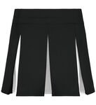 100% polyester double knit * Girls fit * Covered elastic waistband * Contrast color pressed box pleats with yoke