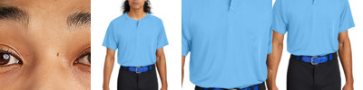 Up your game with a 2-button henley that features moisture wicking. 3.8-ounce, 100% poly interlock with PosiCharge technology UPF rating of 30+ Tear-away label Dyed-to-match buttons