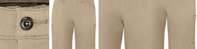 • Two slack-style front pockets, welt back pockets, and dual cargo pockets