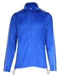100% Brushed tricot polyester fabric • White piping shoulder and sleeve detail • Open bottom with bungee cord and toggles • Two front pockets • covered elastic cuffs • Embroidered logo on left sleeve • Sizes: XS-2XL