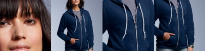 75% combed ring-spun cotton/25% polyester fleece • 7.2-oz. • 30 singles • unlined hood • white circular drawcords • 3/4" contrast white neck tape • tubular construction • back patch • 2" rolled forward shoulders • contrast white metallic zipper with YKK slider • 1x1 athletic rib-knit with spandex • triple-needle topstitched neck • shoulders and waistband • woven label • Sizes: S-2XL
