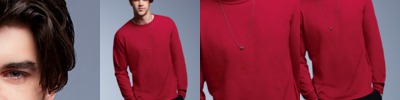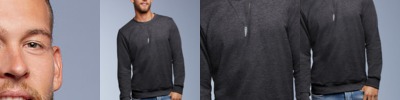 40% preshrunk ring-spun cotton/60% polyester terry fleece • 7-oz. • 30 singles • tubular construction • 1/4" contrast grey neck tape • 2" rolled-forward shoulders • 3" 1x1 rib-knit cuffs and waistband with spandex • double-needle topstitched neck, shoulders and waistband • woven label • Sizes: S-3XL