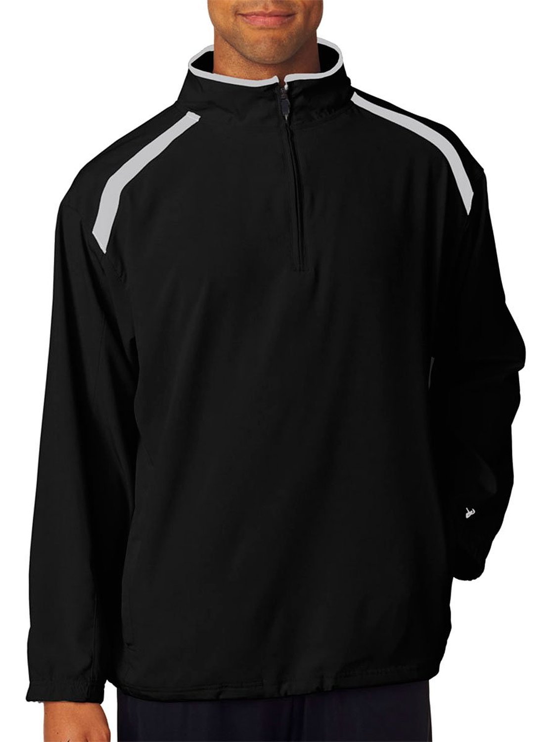 93% Polyester/7% Spandex • Water and wind resistant • Contrast shoulder inserts on front, back and top of sleeve ends • 7" Locking zipper front with spandex reinforced rib knit back neck collar • 9" Zipper on right side seam for easy on/off • Open bottom with bungee cord and hidden toggles on left side seams • Contrast sleeve hem • Embroidered Badger logo on left sleeve • Sizes: XS-4XL