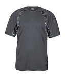 100% poly moisture management/anti microbial performance fabric • 3.5 oz • Contrast Digital side and sleeve panel inserts • Self-fabric collar • Double needle hem with tack • Badger heat seal logo on left sleeve • Sizes: XS-4XL