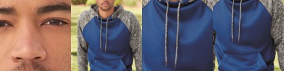 - Solid fleece body with charcoal fleck hood, drawcord and sleeves