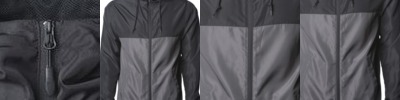 - Concealed single nickel plated zipper, gripper at neck